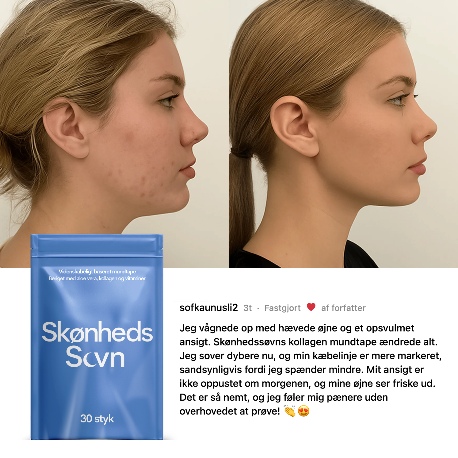 Jeg har brugt kollagen mundtapen i en måned nu og kan næsten ikke tro, hvor meget det har forbedret både min søvnkvalitet og min huds udseende...